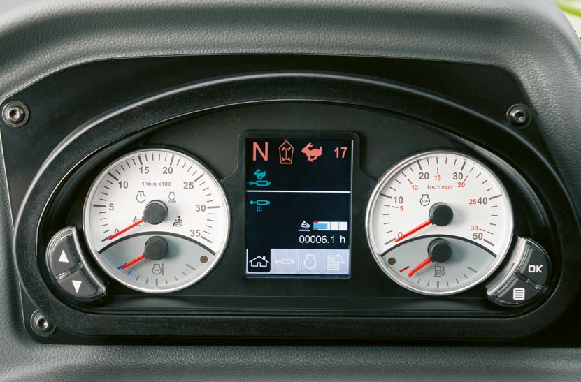 Навіть недосвідчені оператори швидко освоюються з телескопічним навантажувачем, незалежно від того, до якої серії він належить, малої чи великої. Надійний важіль керування дозволяє пропорційно управляти основними функціями. Термінал із кольоровим дисплеєм діагоналлю 3,5 дюйма з першого погляду надає інформацію про всі важливі дані машини. Він розташований у полі зору оператора й дуже легко чита- ється за будь-якого освітлення.