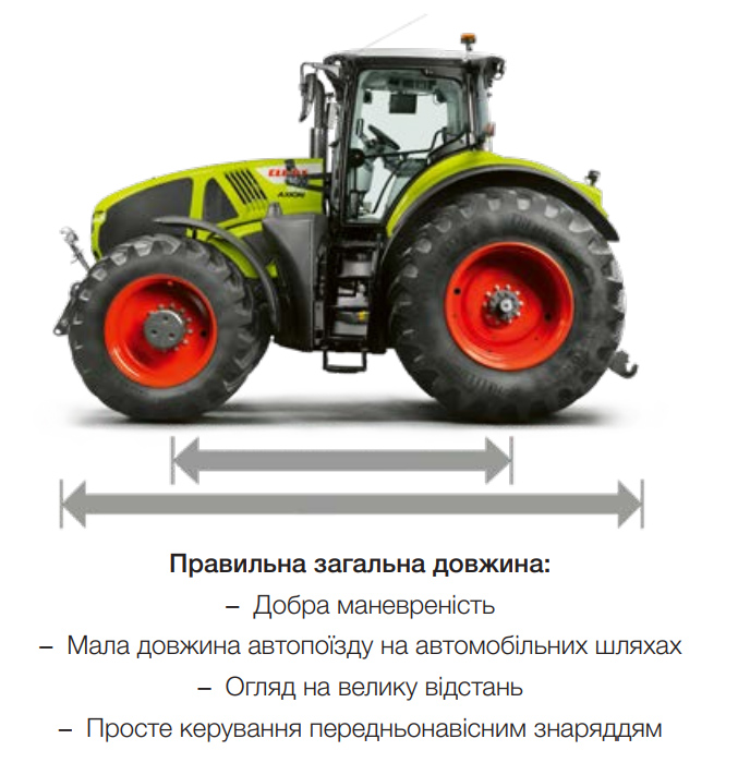 Щоб повністю вичерпати потенціал понад 400 к. с., концепція повинна працювати. AXION 900 якраз виконує всі умови, його колісна база становить 3,15 м. Завдяки продуманій конструкції він зберігає маневреність на полі та керованість на дорогах загального користування. А загальна довжина з відповідним навісним знаряддям не виходить за встановлені законом рамки. Оскільки довга колісна база та оптимальний розподіл навантаження забезпечують передачу тягового зусилля на ґрунт, то під час виконання багатьох робіт, передусім транспортування, можна відмовитися від додаткового фронтального баласту. Це допомагає заощаджувати пальне й мінімізувати зношування шин на дорозі.